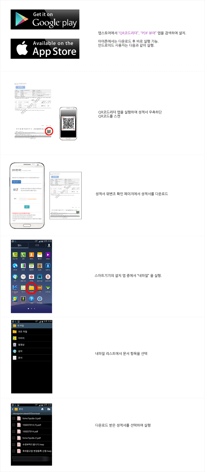 앱스토어에서 "QR코드리더"앱을 설치 하신 후 발행된 성적서 우측하단의 QR코드를 스캔 하시면 성적서진위여부 및 내용확인이 가능합니다.